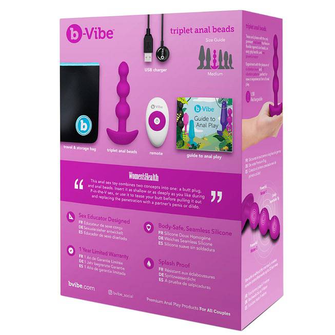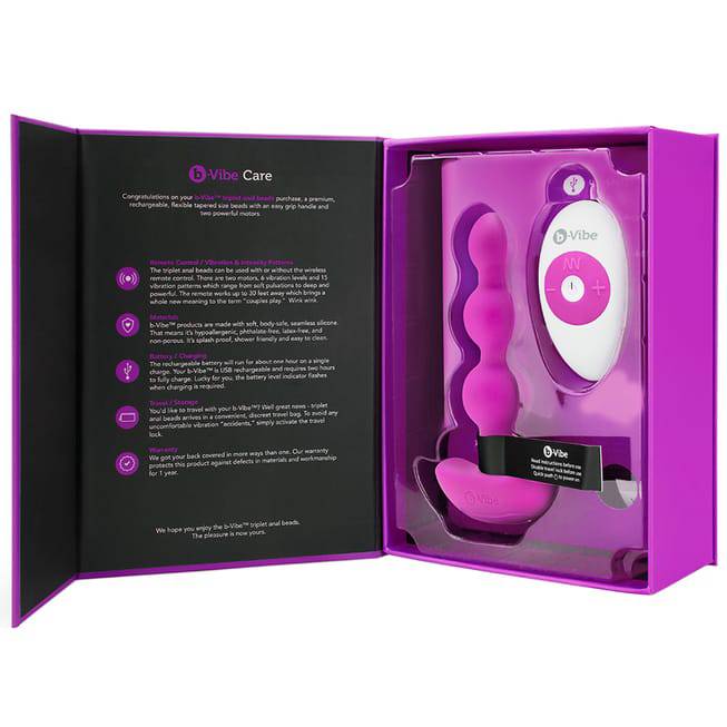 Plug cây thông rung b-Vibe Triplet, remote điều khiển, cáp sạc USB từ tính, hướng dẫn thực hành anal, túi lưu trữ.