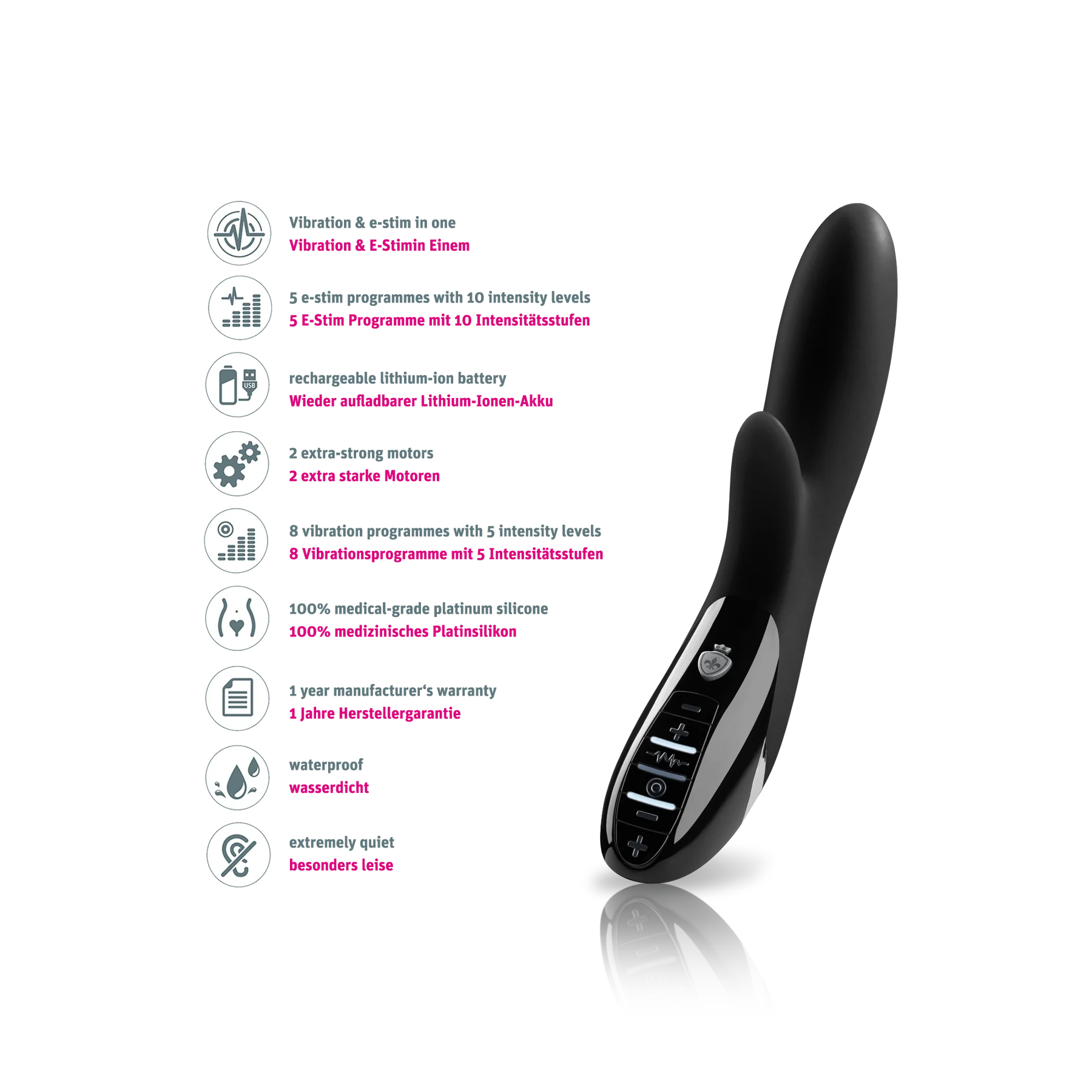 Dưới đây là chi tiết thông số giúp bạn hình dung rõ ràng sức mạnh sản phẩm rung đôi e-stim này: