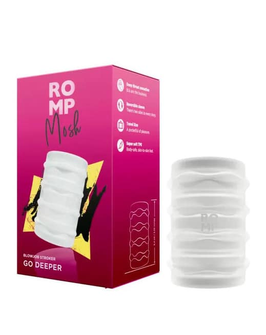 Mỗi mặt của masturbator Romp Mosh có họa tiết texture riêng biệt, tạo cảm giác mút nuốt mạnh mẽ, kích thích mọi giác quan. Sản phẩm kéo giãn tối đa, ôm sát hoàn hảo dù kích thước lớn nhỏ. Kết hợp gel bôi trơn gốc nước để tăng khoái cảm, tránh ma sát da hiệu quả. 😍
