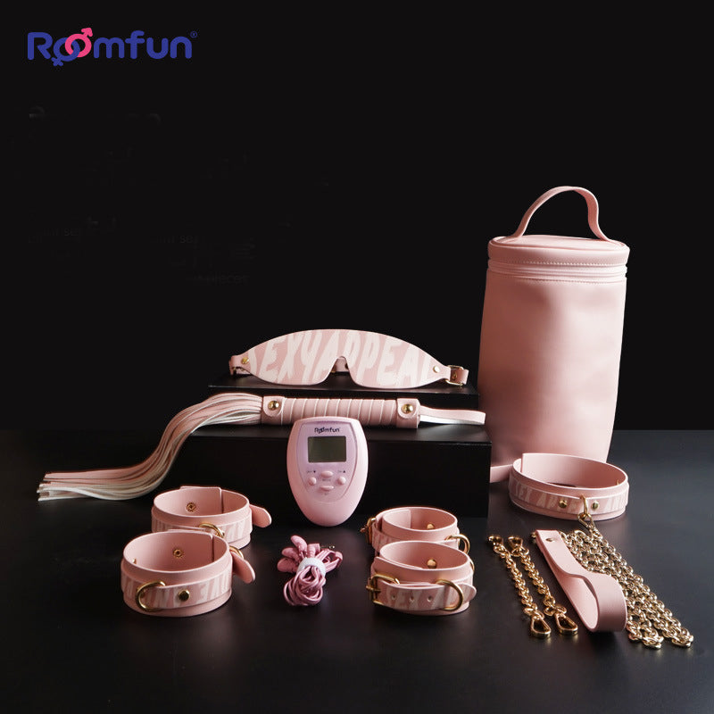 Bộ đầy đủ phụ kiện: vòng cổ kéo (traction collar), bịt mắt (eye mask), còng tay bondage (bondage cuffs), vòng chân (anklet), túi da cao cấp và máy massage xung điện (electronic pulse massager) 🔗🖤.